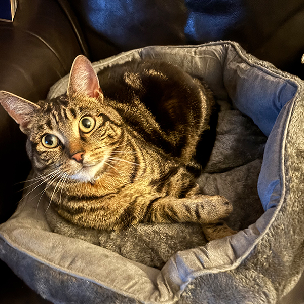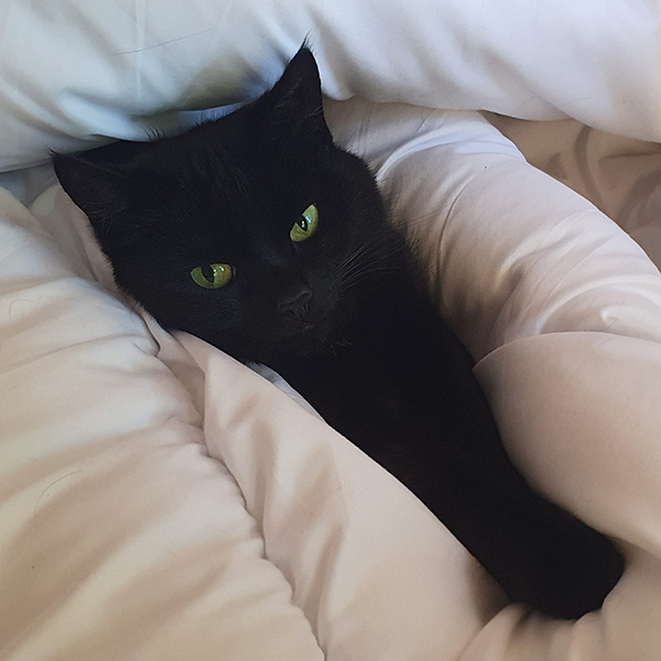 Kira is 15, a petite and savvy cat who rules the house and is very upfront about which of her hoomans she deems worthy of her attention. That said, when Kira loves you she loves fiercely and protectively. Kira hasn’t been too well recently, she’s developed a tumour and has occasional seizures so we’re spoiling her while we still can. She of course knows this, so has decided she’s too good for cat food and will only eat tuna, and meows at the top of her voice at 4am every morning until her ‘servants’ in the house get up to feed her…